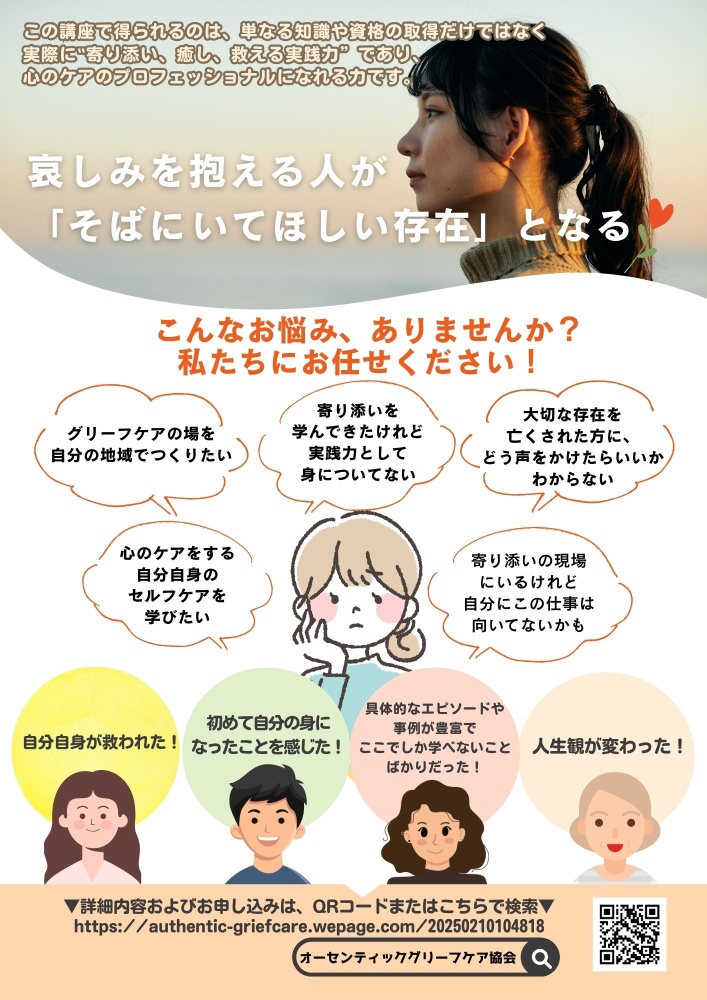 | スクール 資格取得講座 | ◇オンライン形式(Zoomを使用) ◇内容 【初級】AGCA認定グリーフケアワーカー養成講座 【中級】AGCA認定グリーフケアマイスター養成講座 【上級】AGCA認定グリーフケ支援士養成講座 ※資格取得講座につきましては、オーセンティックグリーフケア協会のホームページよりご確認いただけます。 |